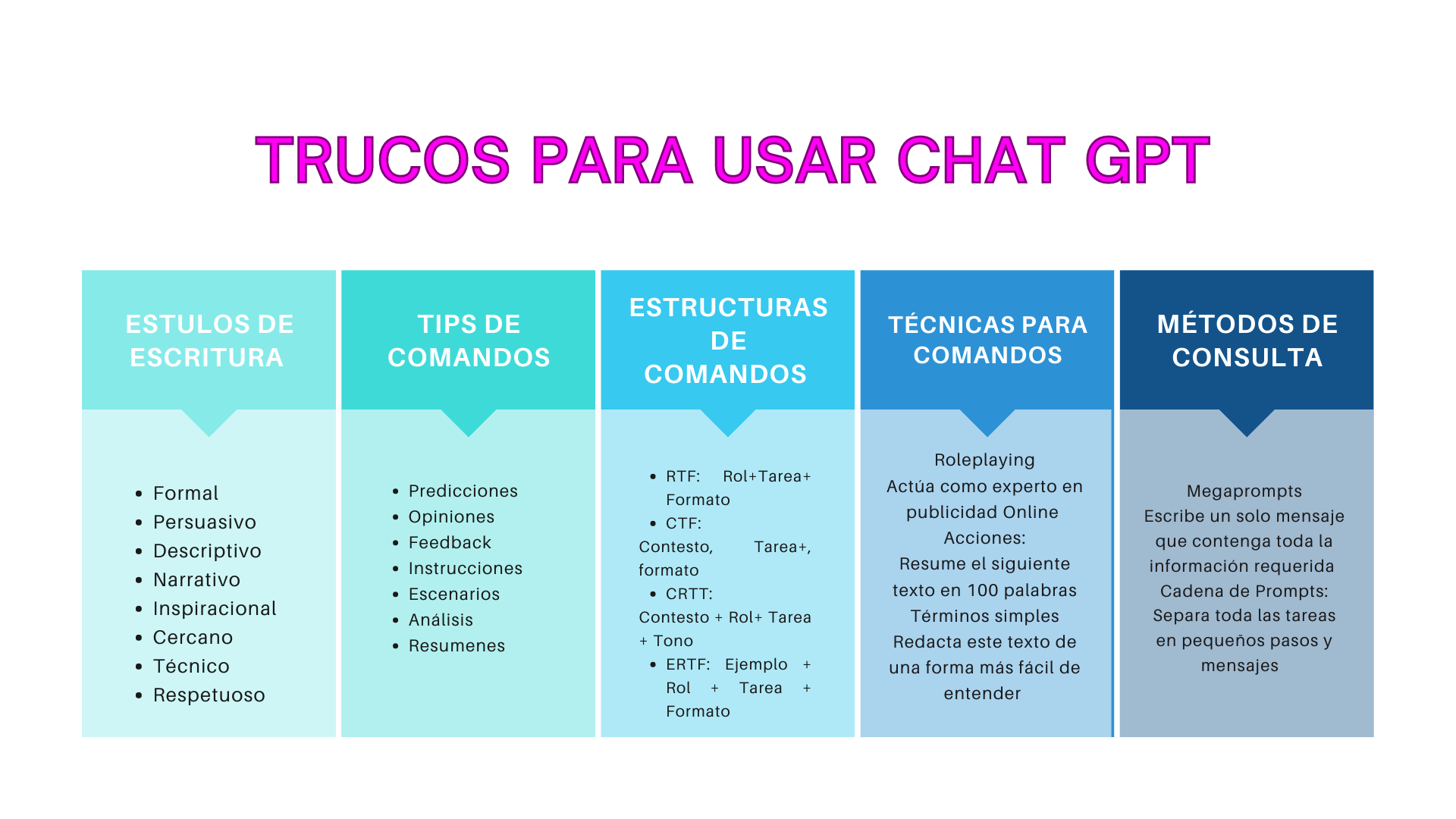 Aquí te comparto esta una gráfica con fórmulas y estructuras útiles para formular solicitudes a Chat GPT.